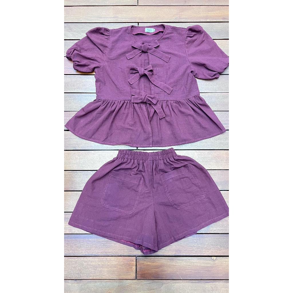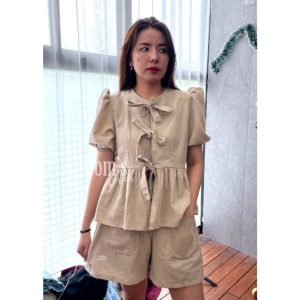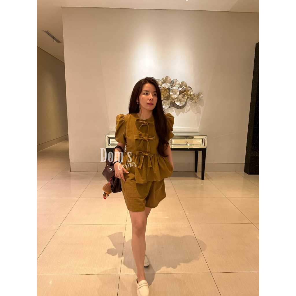 Domscorner – Fuyumi set – ribbon cowuette blouse – puff sleeve – peplum top – celana pendek highwaist – short – outer – cardigan – short sleeves